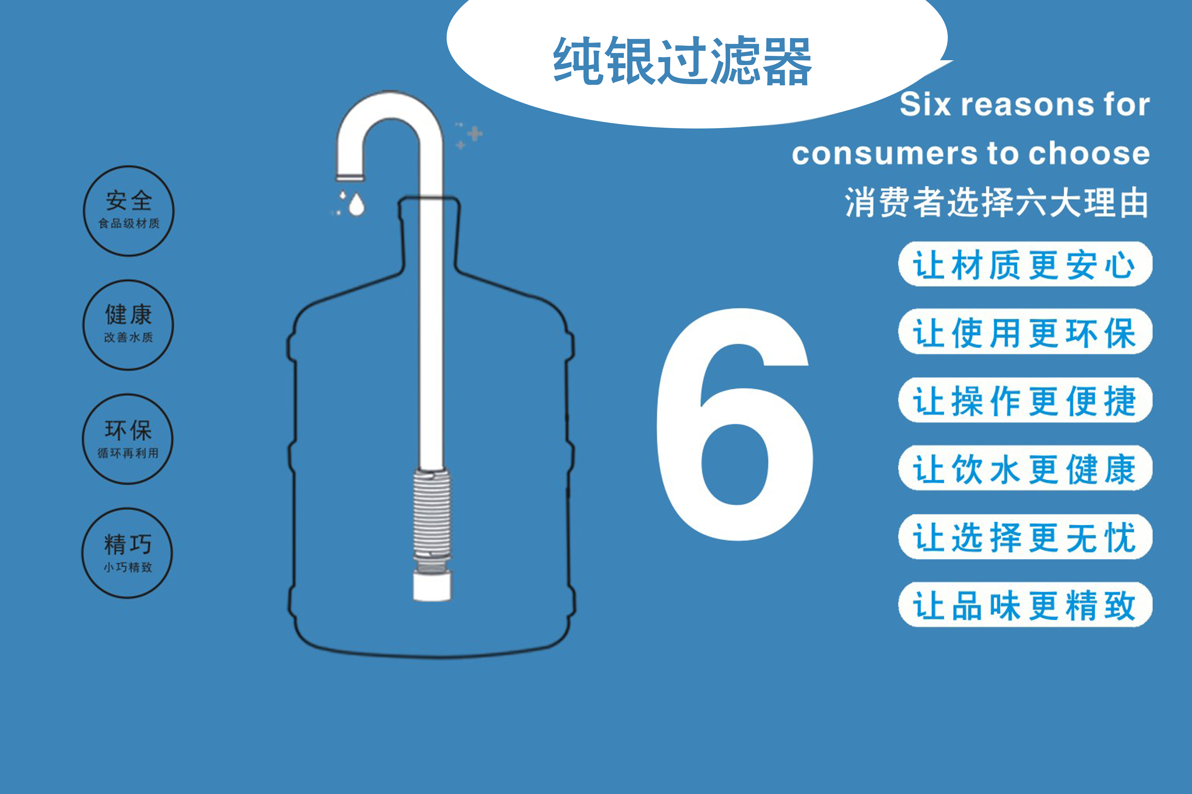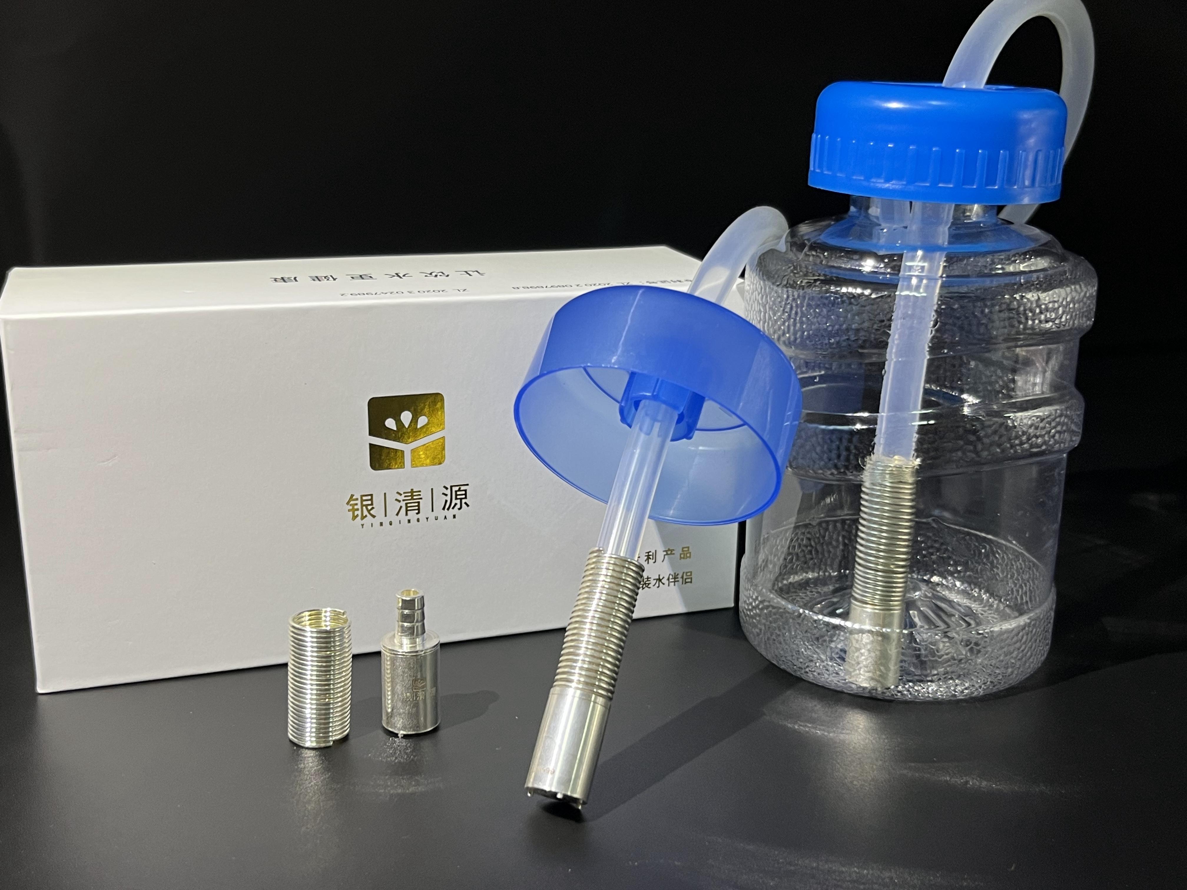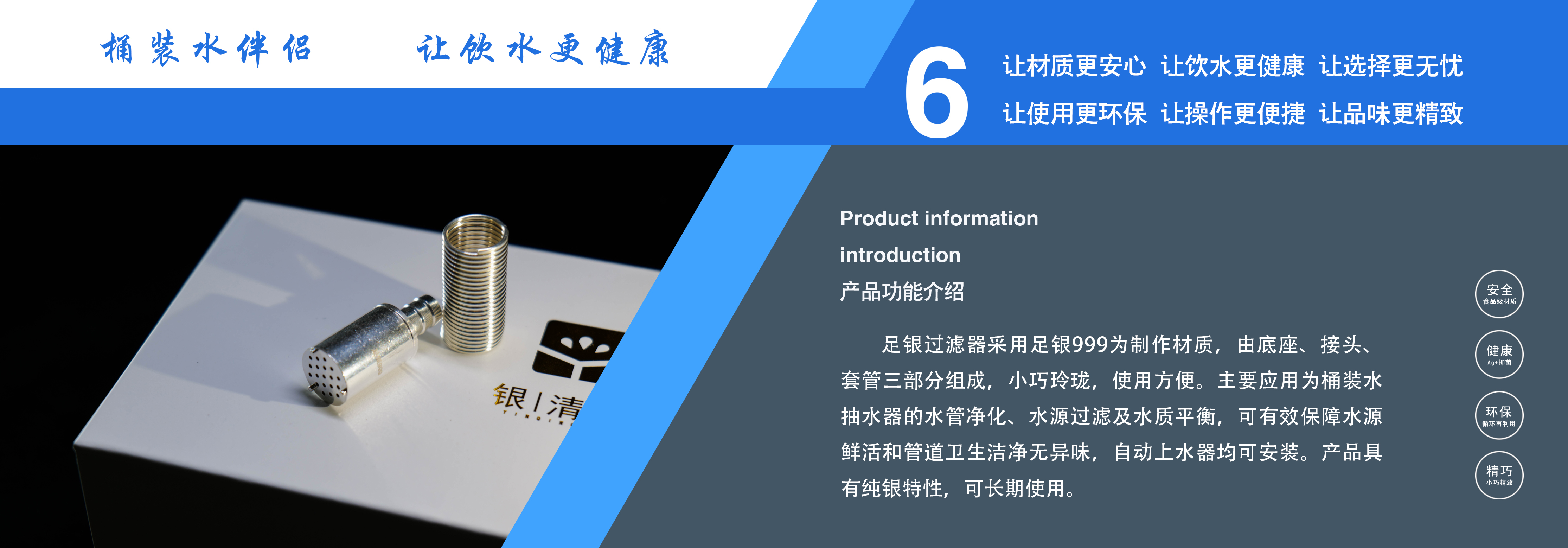 纯银过滤器/桶装水伴侣,采用足银999为制作材质,由底座、接头、套管三部分组成,小巧玲珑,使用方便。主要应用为桶装水抽水器的水管净化、水源过滤及水质平衡,可有效保障水源鲜活和管道卫生洁净无异味,自动上水器均可安装。产品具有纯银特性,可长期使用。专利产品 食品级认证