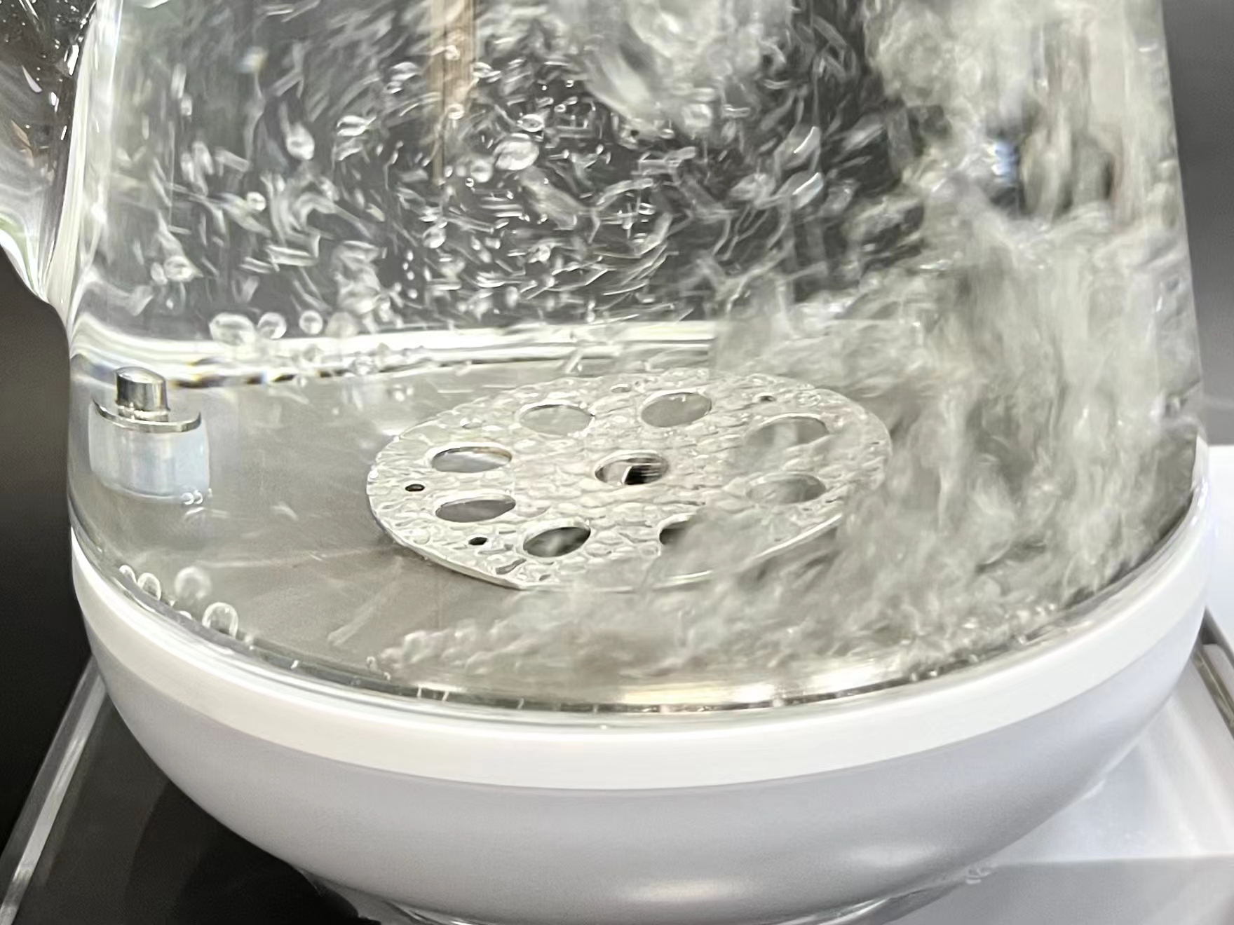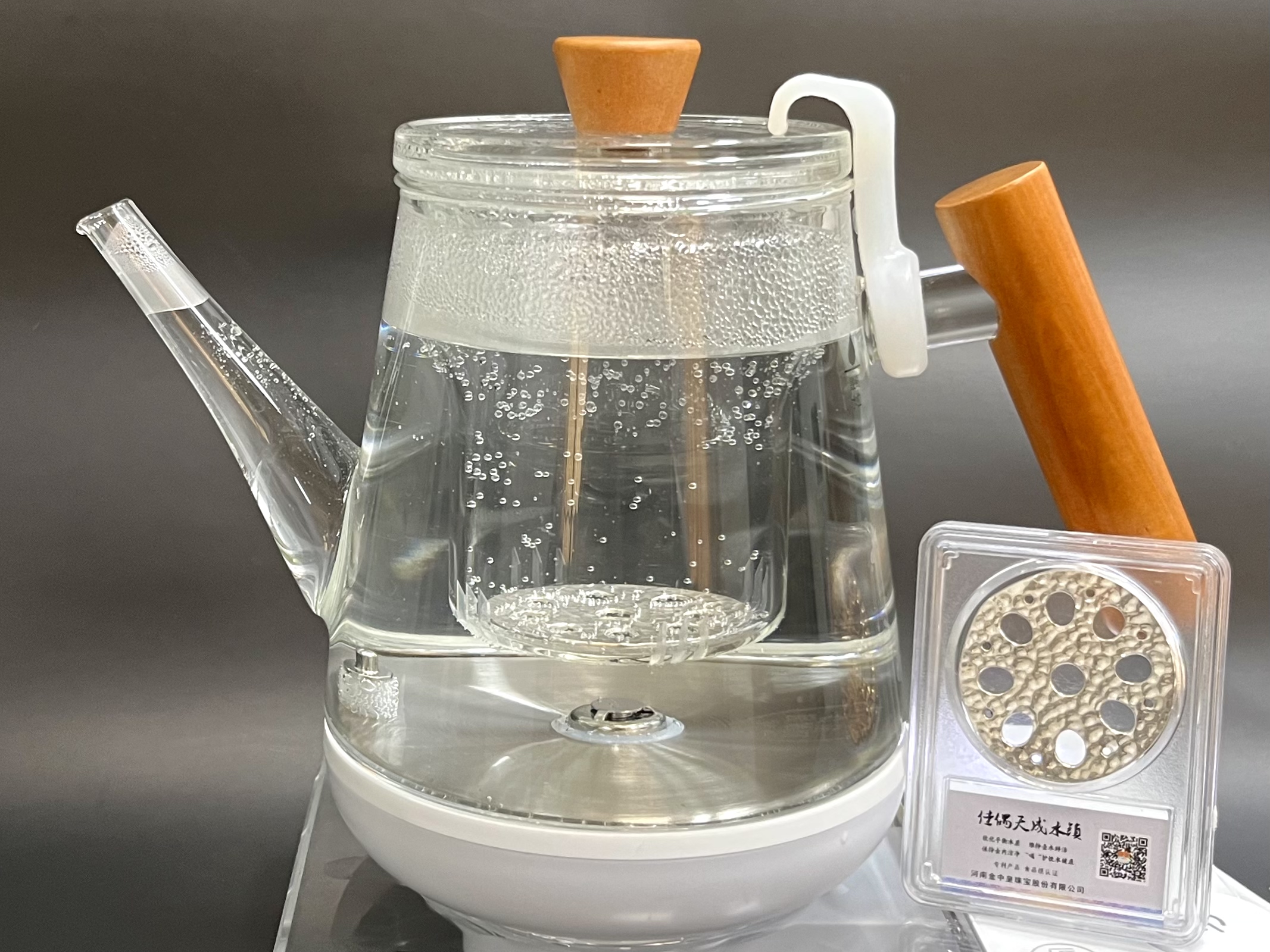 煮水/茶伴侣具有纯银特性,正面布满锤纹,背面布有三个支点,本产品主要应用于煮水壶,将佳偶天成水镇放置于煮水壶中,正面朝上,三个支点落于壶底,浸泡于壶水中,在高温加热煮水过程中能产生大量气泡,从而起到改善水质和增加口感的效果。产品小巧玲珑,使用方便,可长期循环使用。